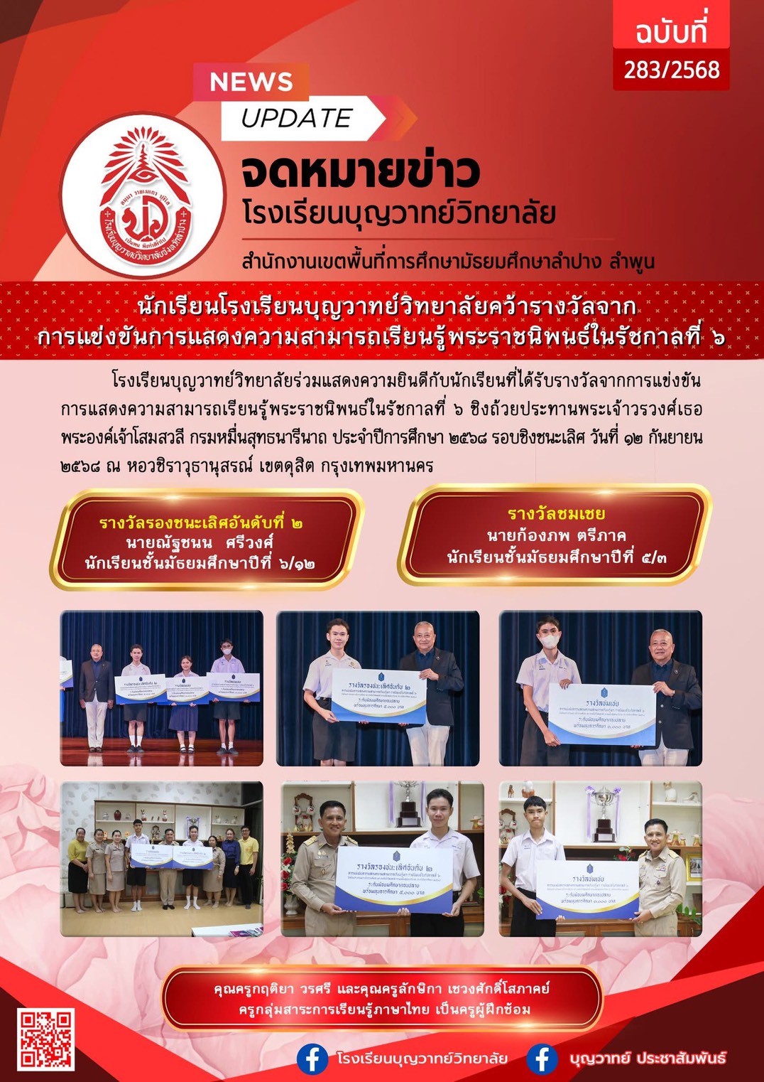ได้รับรางวัลการแข่งขันการแสดงความสามารถเรียนรู้พระราชนิพนธ์ในรัชกาลที่6