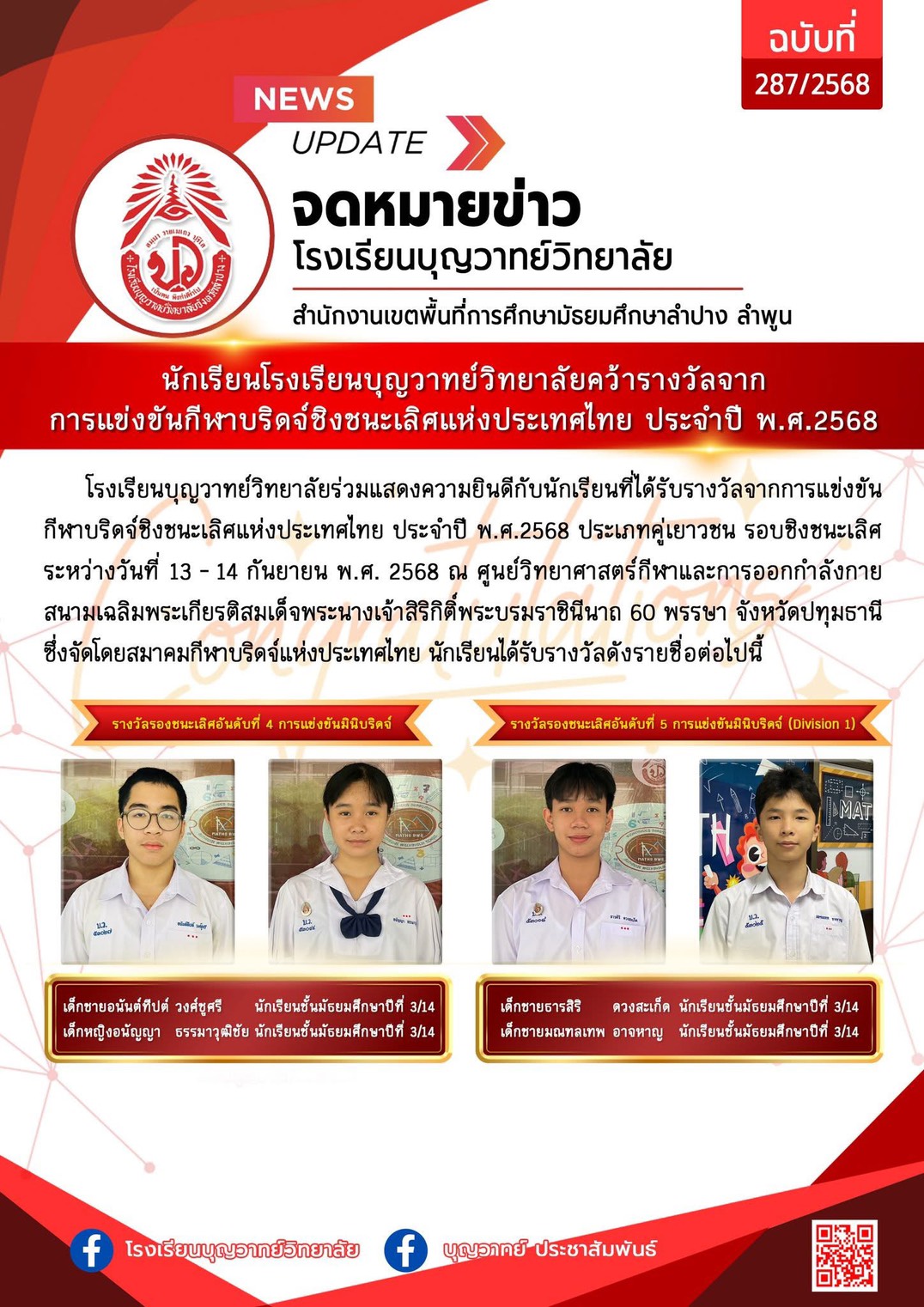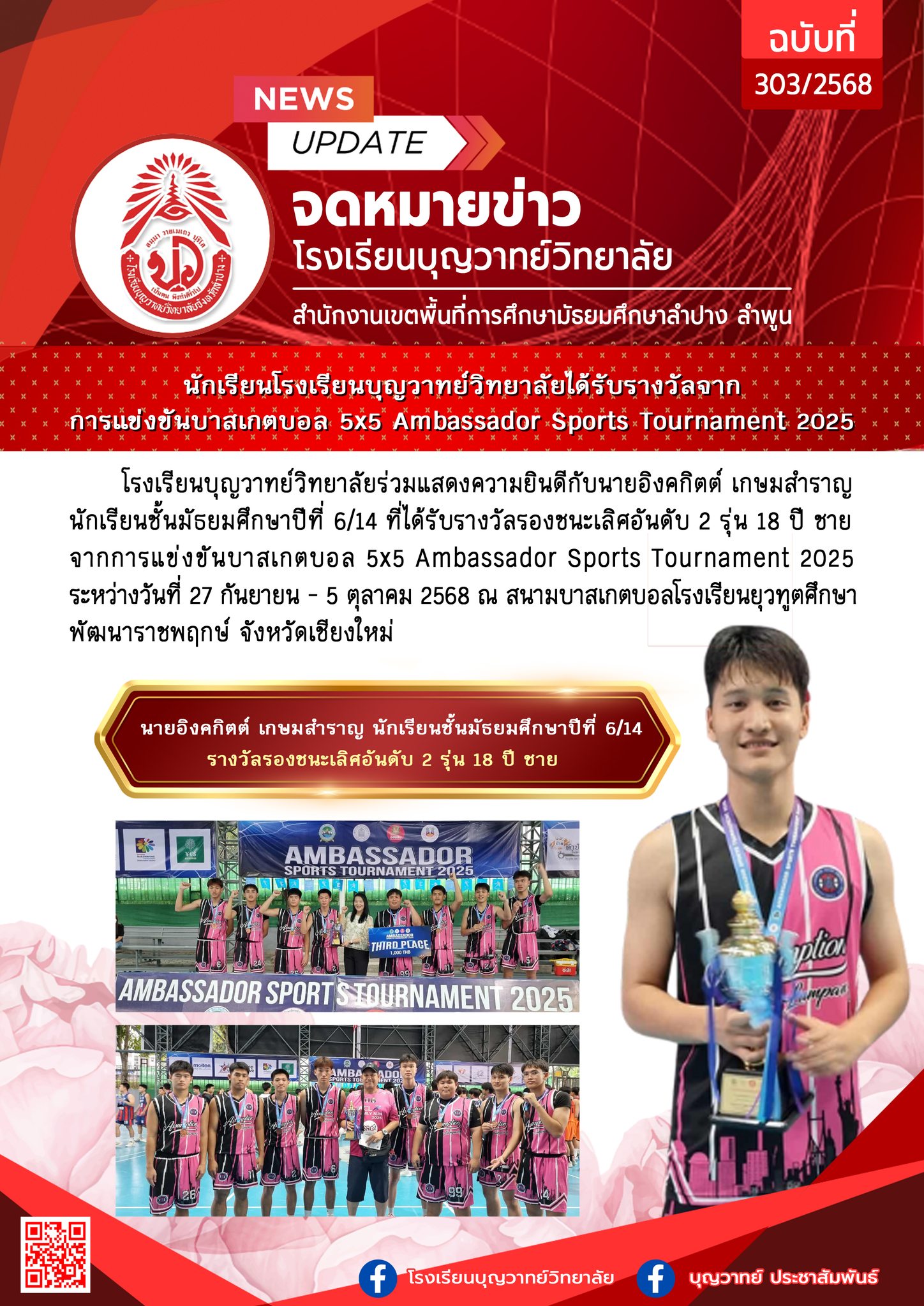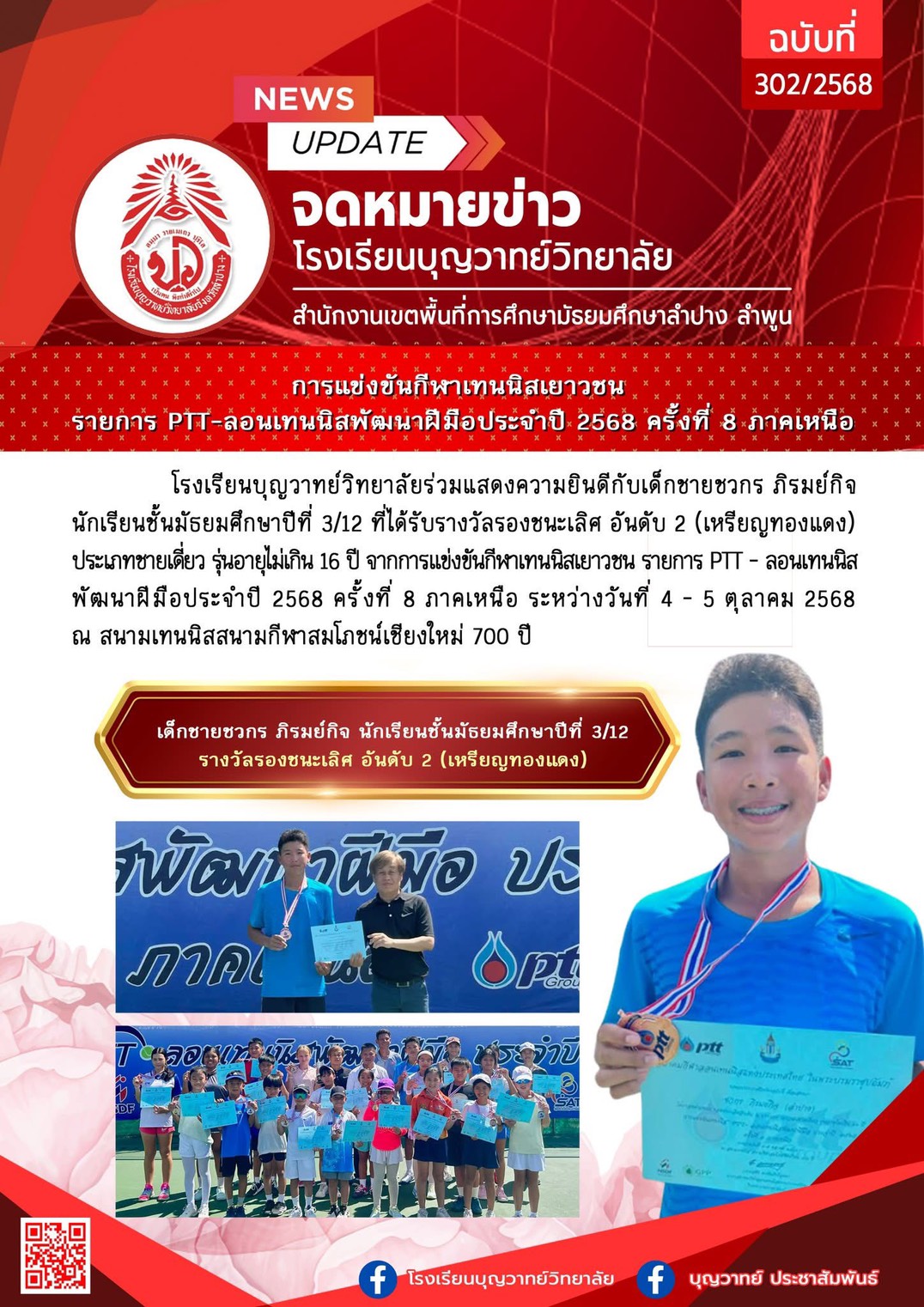 ได้รับรางวัลการแข่งขันกีฬาเทนนิสเยาวชน รายการPTT-ลอนเทนนิสพัฒนาฝีมือ ปี2568