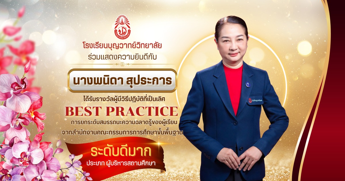 ได้รับรางวัลผู้มีวิธีปฎิบัติที่เป็นเลิศ(Best Practice) ระดับดีมากประเภทผู้บริหารสถานศึกษา การยกระดับสมรรถนะความฉลาดของผู้เรียน