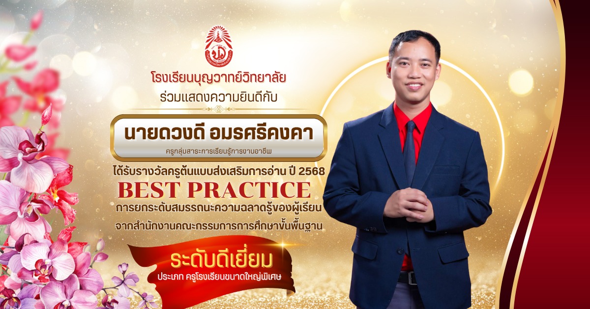 รางวัลครูต้นแบบส่งเสริมการอ่านปี2568(Best Peactice) ระดับดีเยี่ยมประเภท ครูโรงเรียนขนาดใหญ่ การยกระดับสมรรถนะความฉลาดรู้ของผู้เรียน